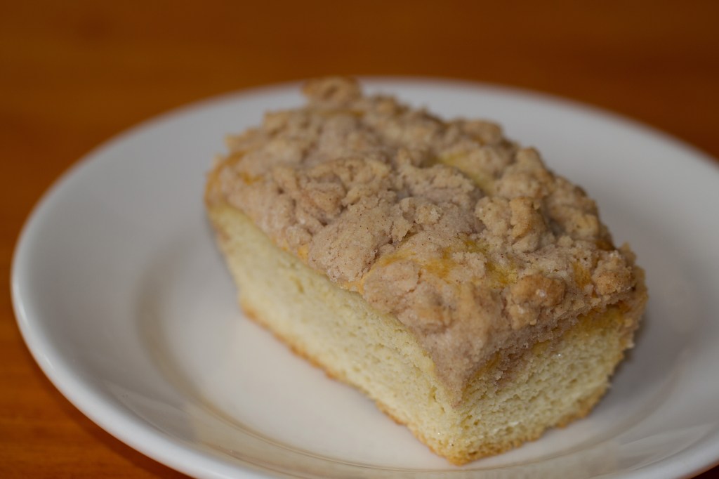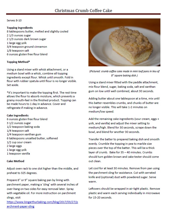 (Pictured: crumb coffee cake made in mini loaf pans in lieu of 8” square baking dish.)