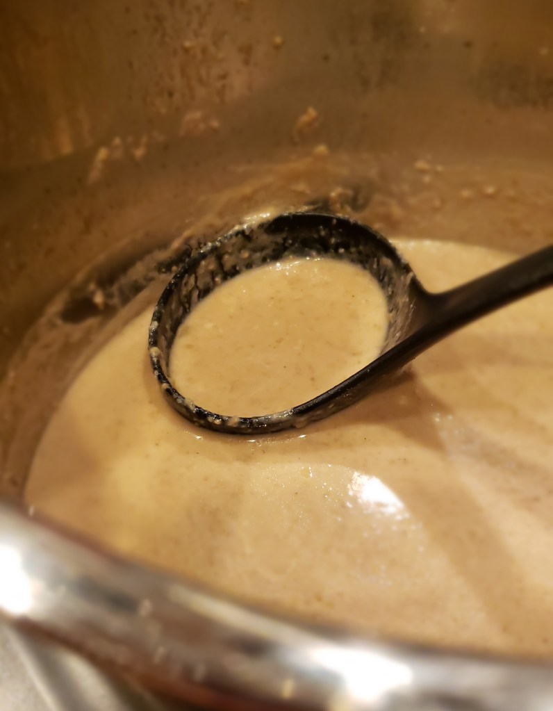 Our household favorite – carefully pour the hot soup into the *blender to the max liquid line (this will not be all the soup). Add corn starch. Blend for about one minute, until silky smooth. Pour soup back into the pot with the un-blended soup. Add liquid smoke, cream, and salt or pepper to taste.  *An emersion blender is also a good choice.